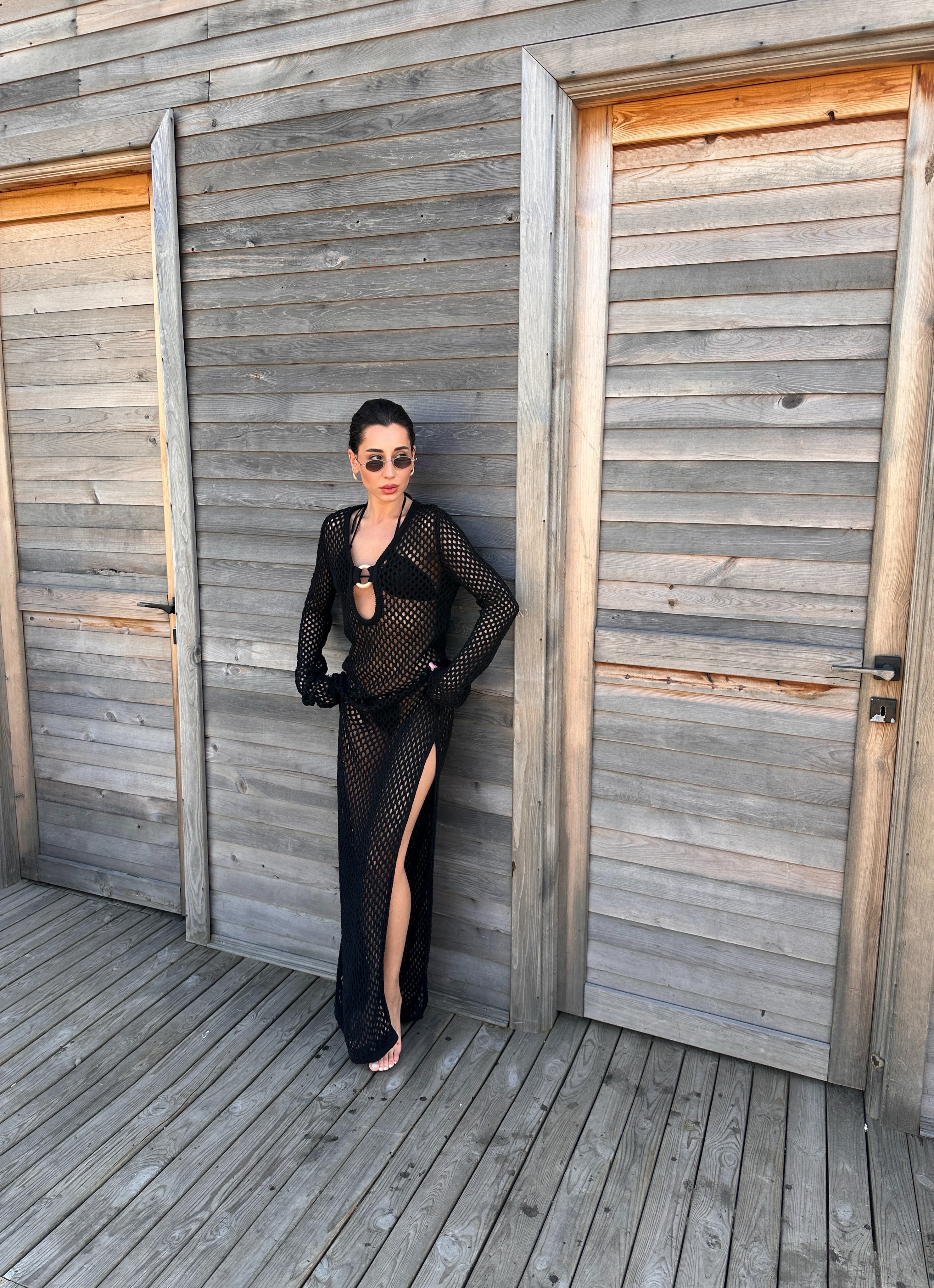 Ahşap Halka Detaylı Triko Elbise, yazın enerjisini yansıtan özel dokusu ve doğal detaylarıyla dikkat çeker. Hafif delikli triko kumaşı ve bel kısmındaki ahşap halka detayıyla plajda hem konforlu hem stil sahibi bir görünüm sunar. Bikini veya mayo üzerine rahatça giyilebilir.