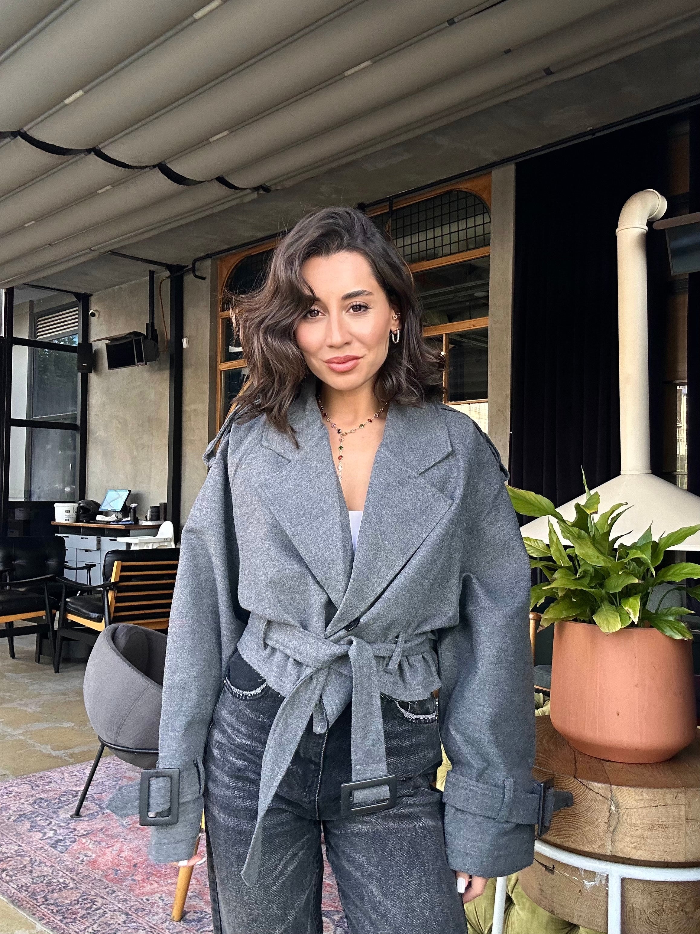 - Model: Cropped (kısa) trençkot formunda, modern & şehirli tarz.