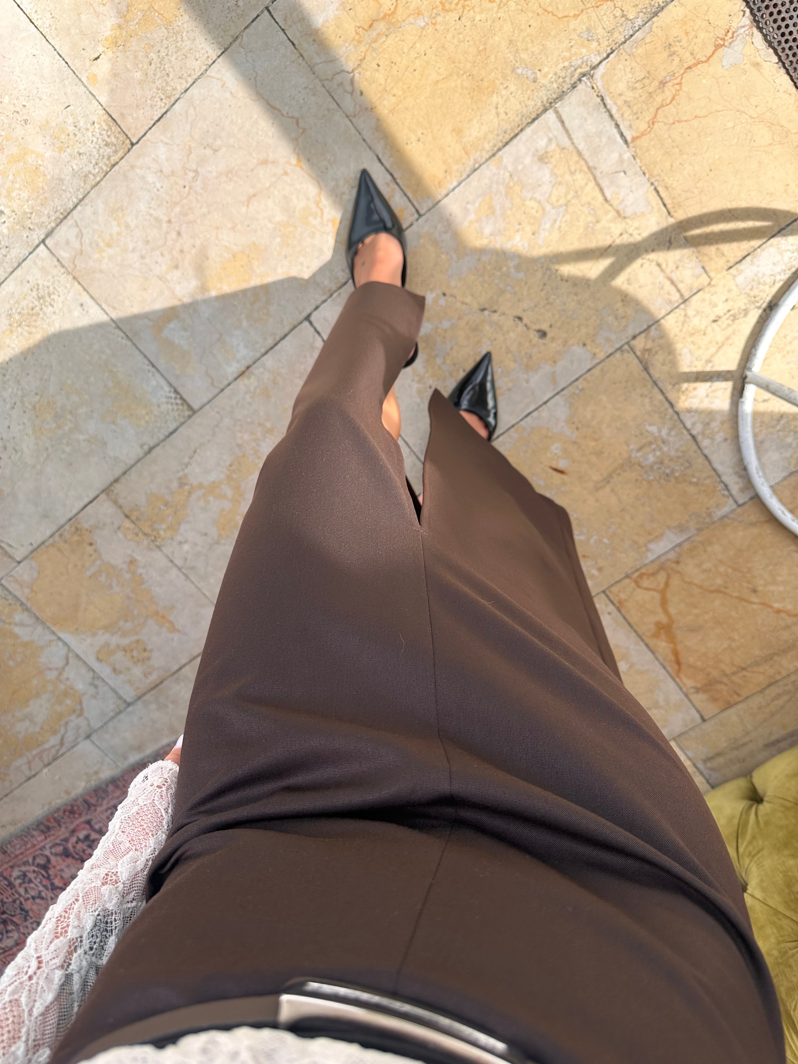 Zarafeti ve modern şıklığı bir araya getiren bu yüksek bel yırtmaç detaylı pantolon, gardırobunuzun kurtarıcı parçası olacak. Özel kalıbı sayesinde vücuda kusursuz oturur, gün boyu rahatlık ve şıklık sunar.