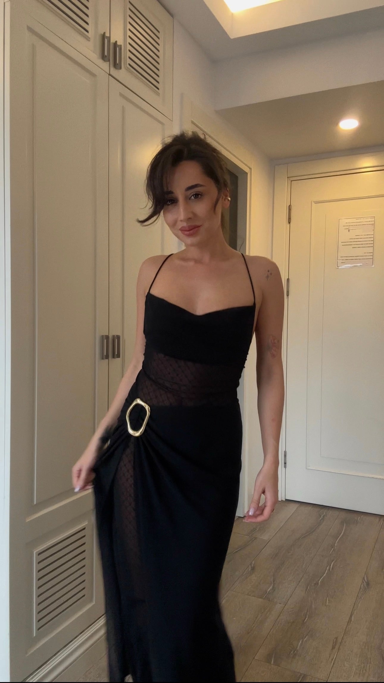 Zarif üst parça cesur bir duruş yaratırken, akışkan etek vücuda kusursuz şekilde oturarak feminen hatları ön plana çıkarır. Hareket ettikçe ortaya çıkan akıcı form, geceye ait lüks hissi tamamlar.